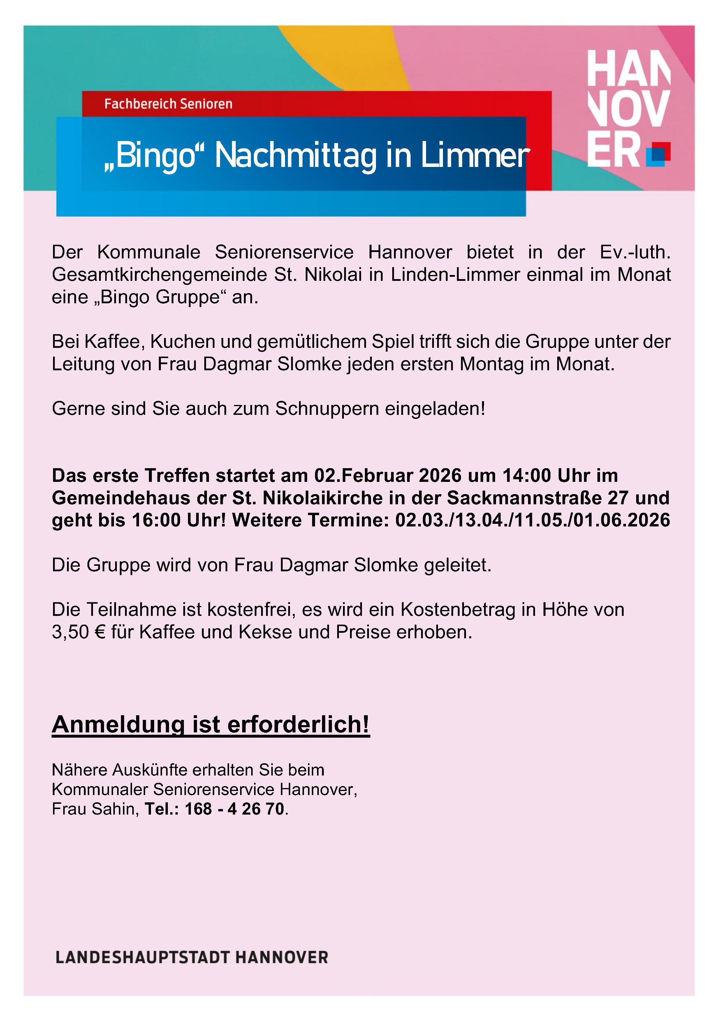 Der Kommunale Seniorenservice Hannover bietet in der Ev.-luth. Gesamtkirchengemeinde St. Nikolai in Linden-Limmer einmal im Monat eine „Bingo Gruppe“ an.